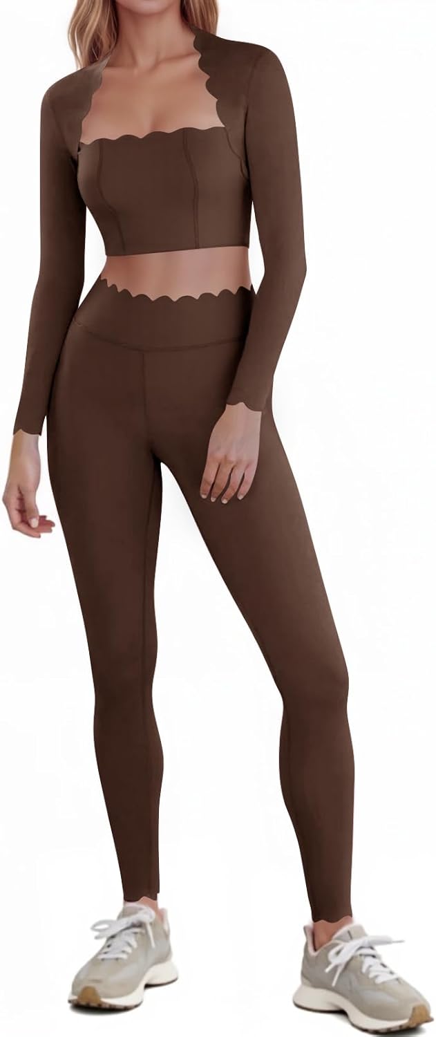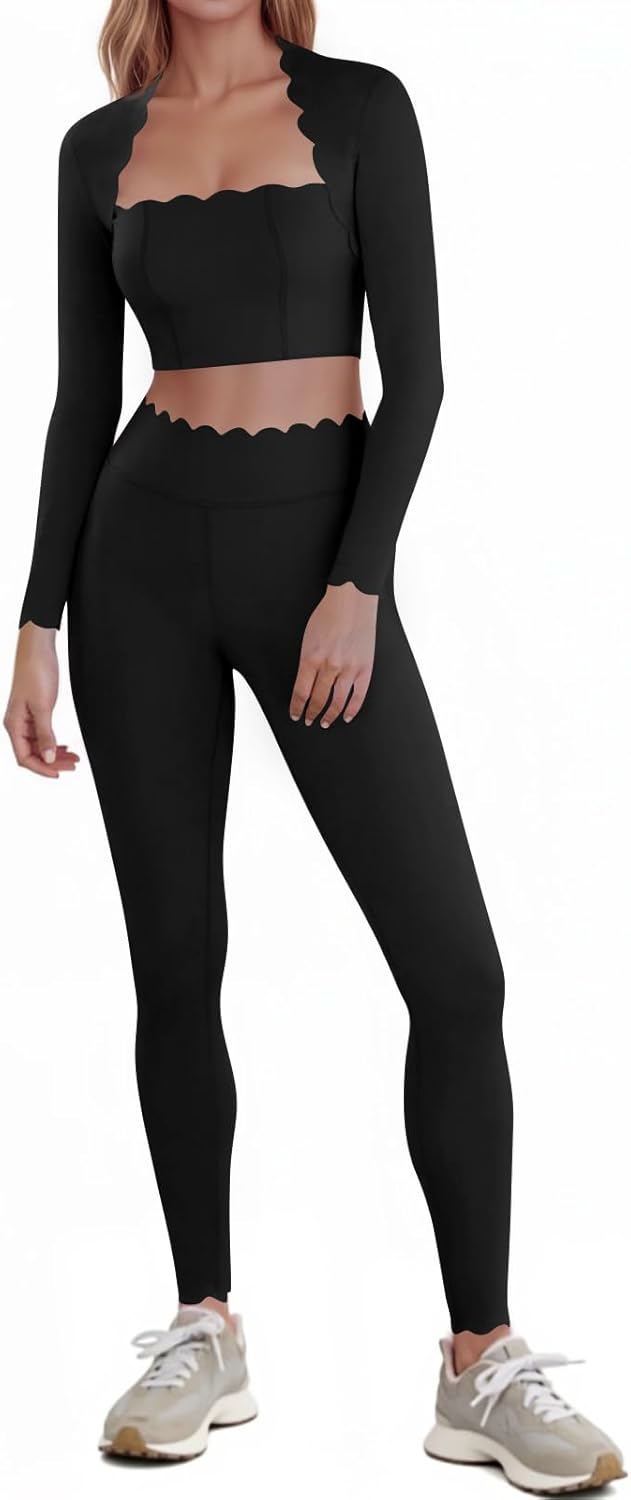 High Waisted Scolloped Leggings with Long Sleeve Stretchy Crop Tops