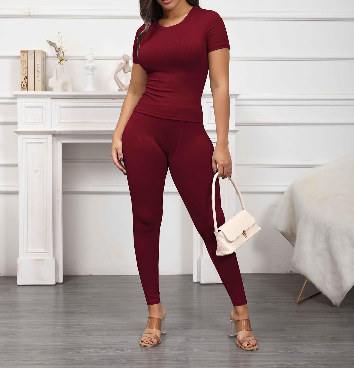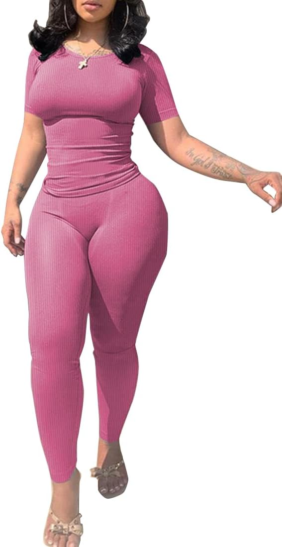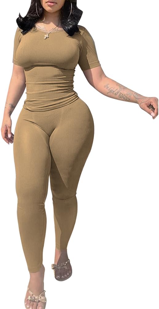 Two Piece Outfits for Women Fitted Crew Neck T-shirt High Waist Legging pants