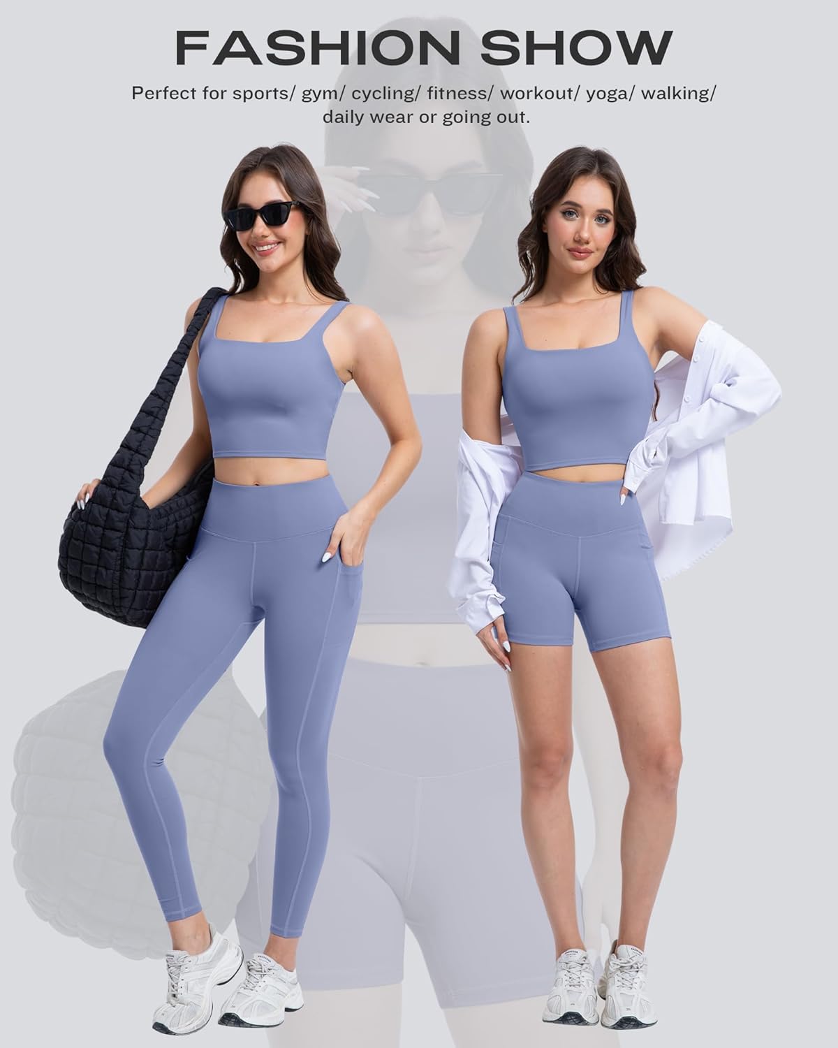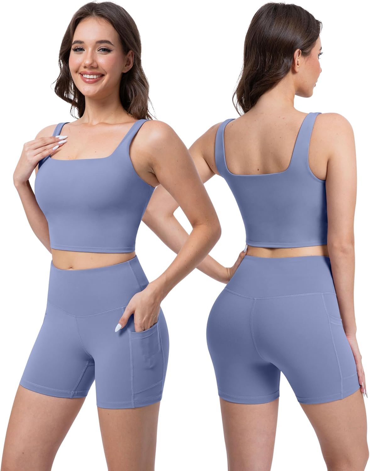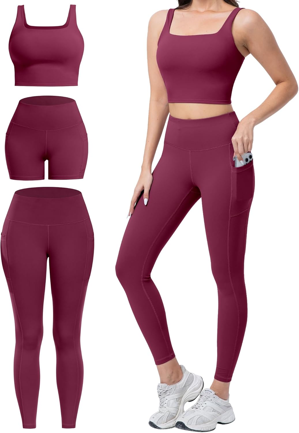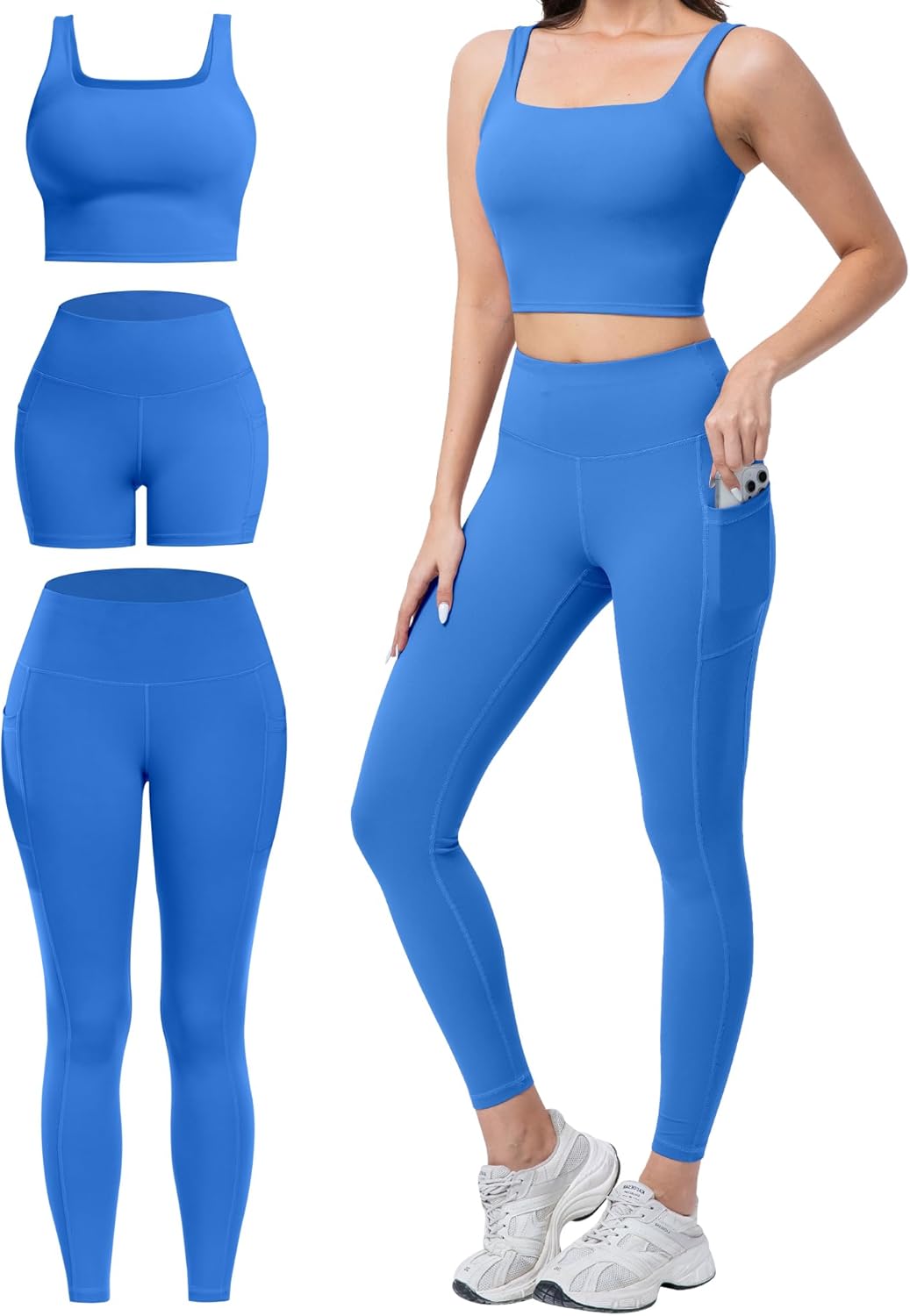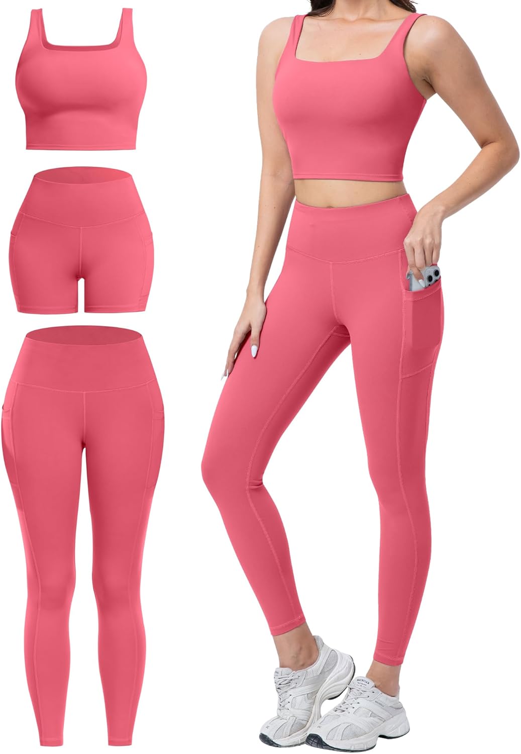 SALSPOR 3 Piece Workout Sets for Women High Waisted Leggings with Pockets Tummy Control Biker Shorts Yoga Sports Bra